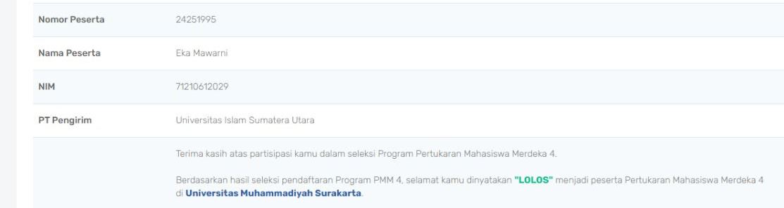 Kelulusan Eka Mawarni ini terkonfirmasi dari akun PMM bahwa dirinya lulus seleksi PMM 4 dengan tujuan ke Universitas Muhammadiyah Surakarta.